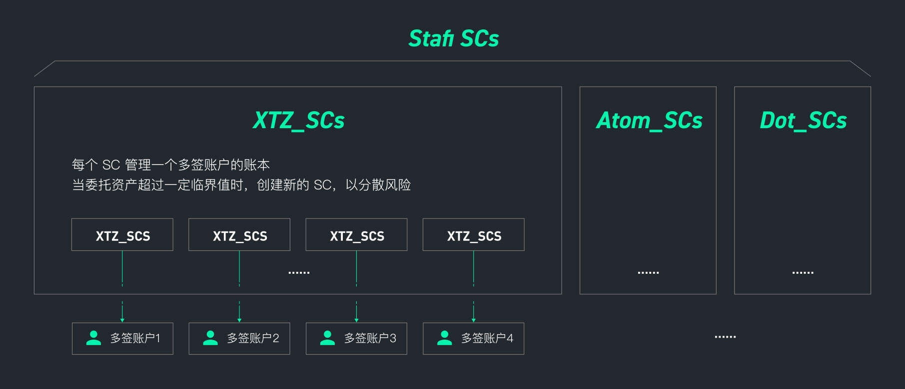 当持币人通过Staking Contract发起Staking时,整个Staking资产关系会集中在一个合约当中,虽然每个Staking都是一个地址发起的,不会影响去中心化程度,但是当Stake资产较为集中时,被攻击的概率就会增大。Stafi通过建立同种Token多个 SC的方式,避免资产的集中。合约整体的数量会根据Stake资产的多少来自动增加,新的资产进入新的Stake合约Stake。同时,Stafi会在初期启动时建立多个SC,Stafi系统会自动将初始Stake的需求平均分配到这些SC中,起到一个保障作用,后期随着Stake需求的增加,逐步将SC的数量增多,并且加以变量区分。