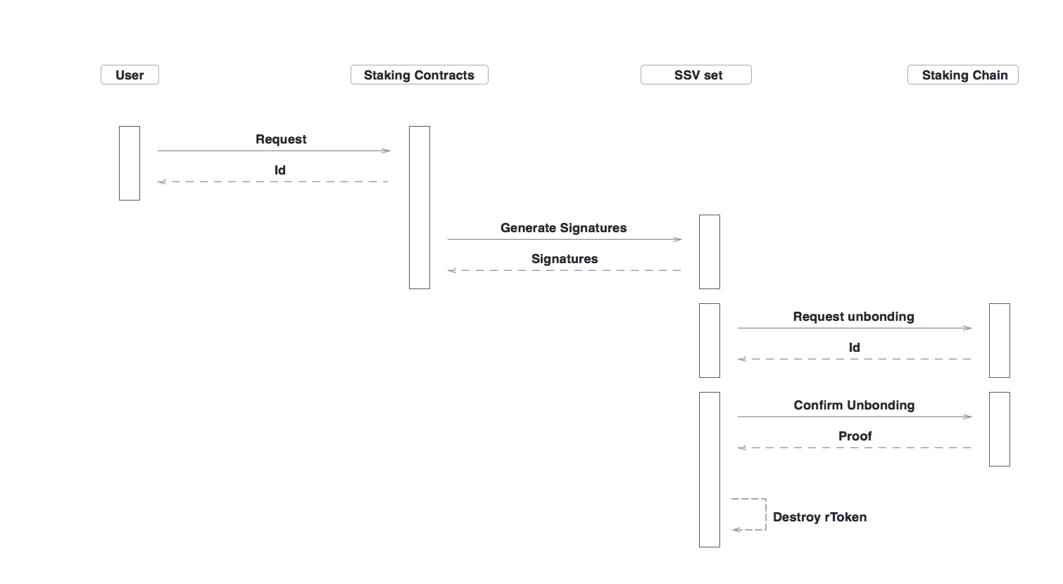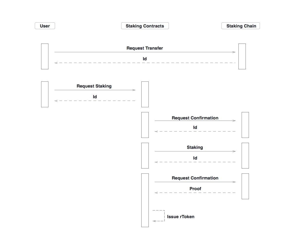 Staking过程如下,用户先和SC交互,然后SC和原链交互。期间,为了让用户的操作足够简单,SC需要承担多次和原链交互的责任,最重要的一点是,SC需要在确定Staking成功之后,才能给用户分发rToken,以下时序图展示了整个的rToken发行过程的请求顺序。